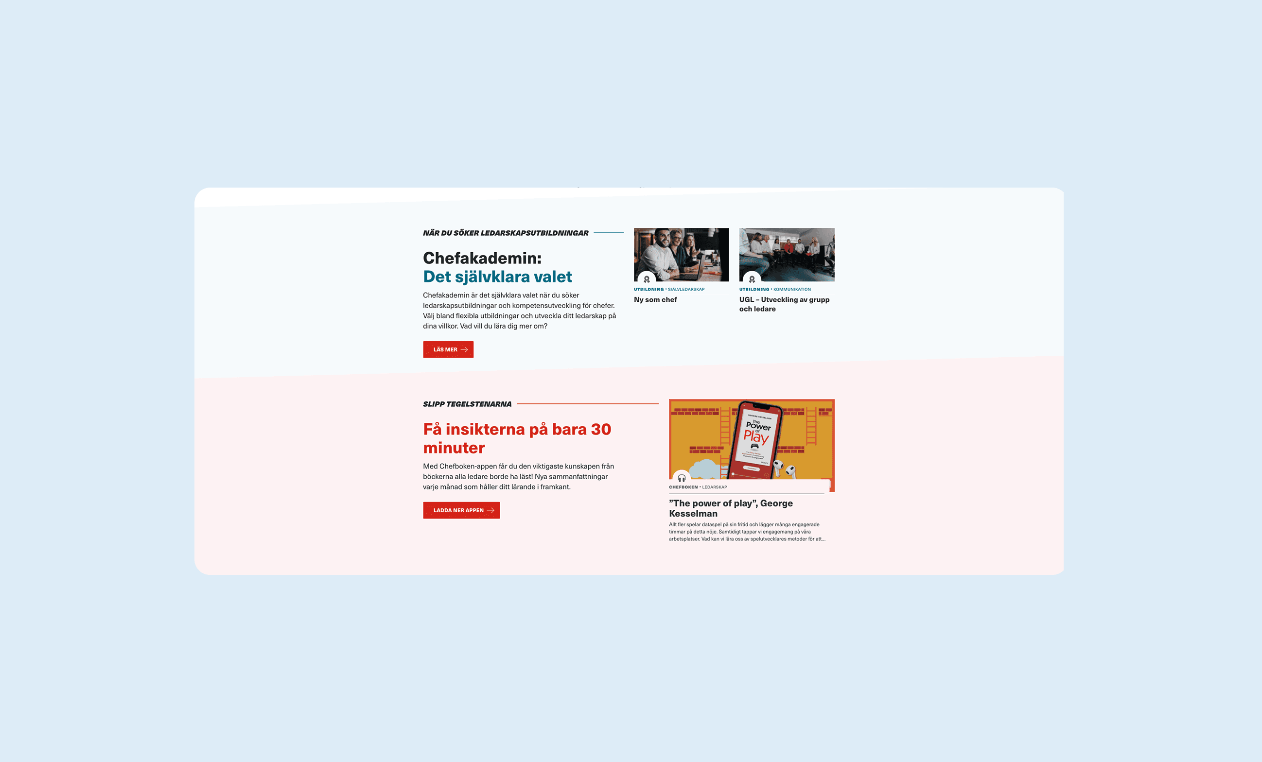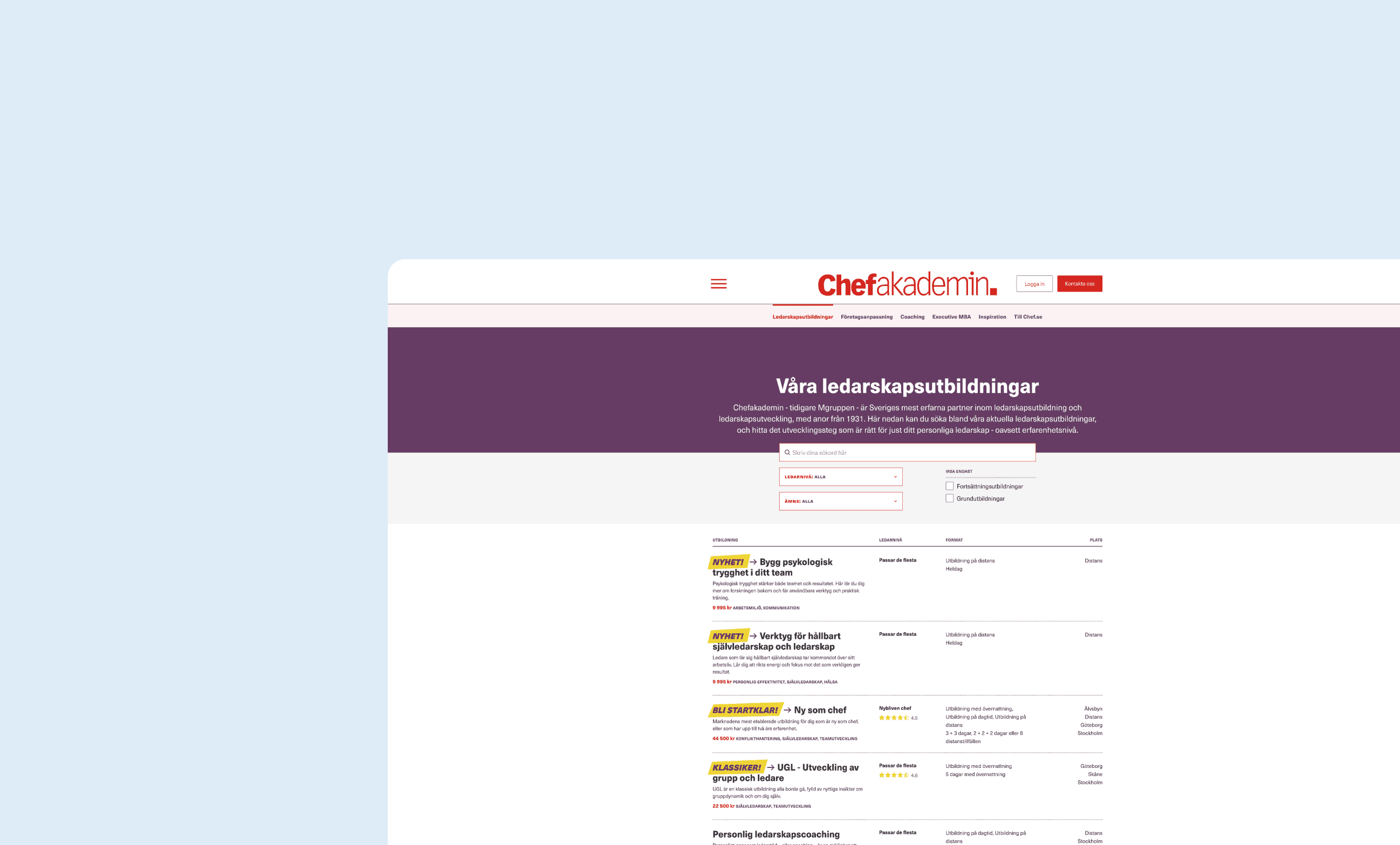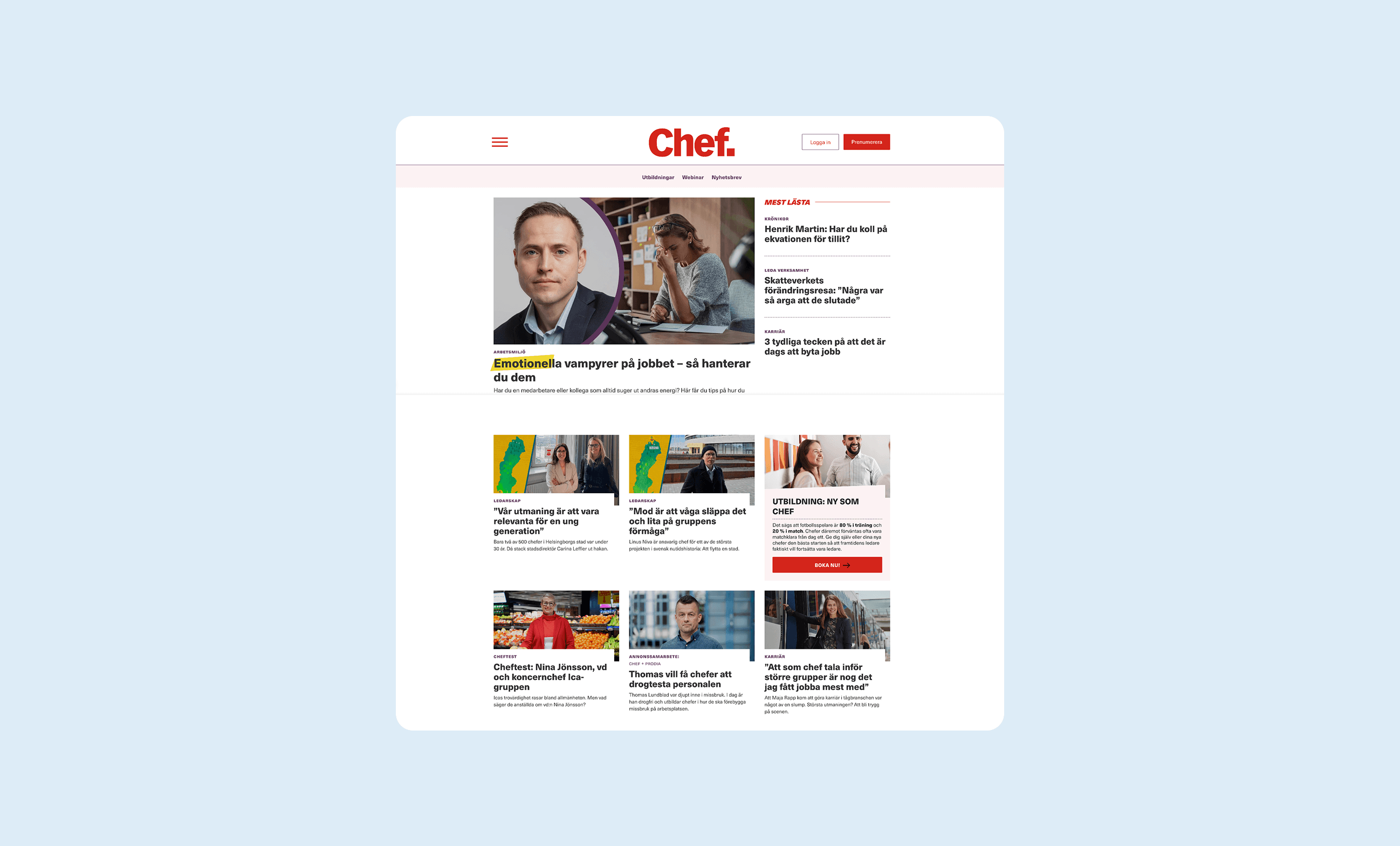 Chef is a magazine and educational platform for managers that merged with Chefakademin and Mgruppen in 2021. Each organization contributed distinct forms of expertise—editorial content, leadership education, and training programs—which needed to be consolidated under a single platform at chef.se. My role as UX/UI Designer was to design a unified experience that allowed users to clearly understand different content types while supporting the transition into a new, shared brand and visual language.